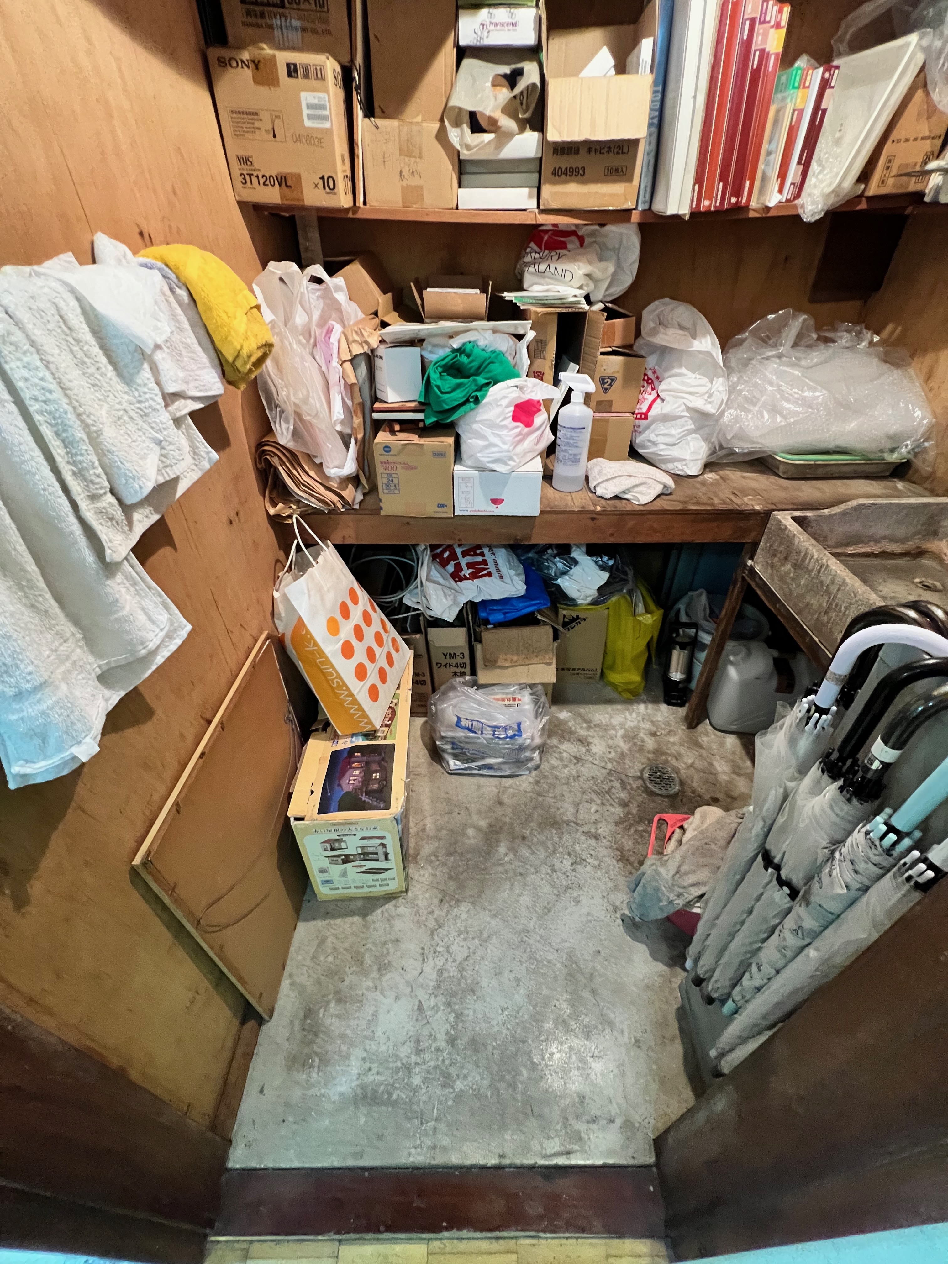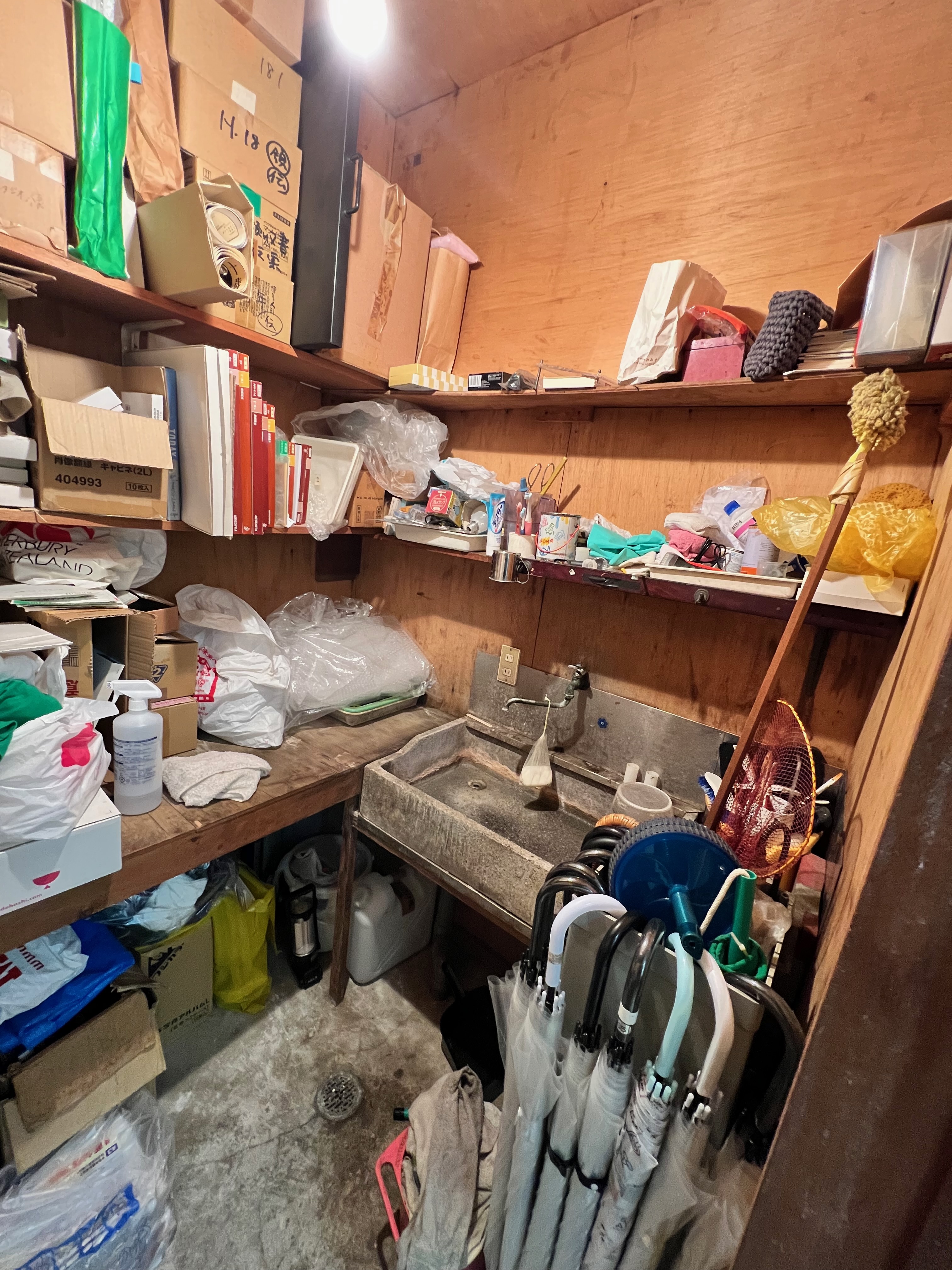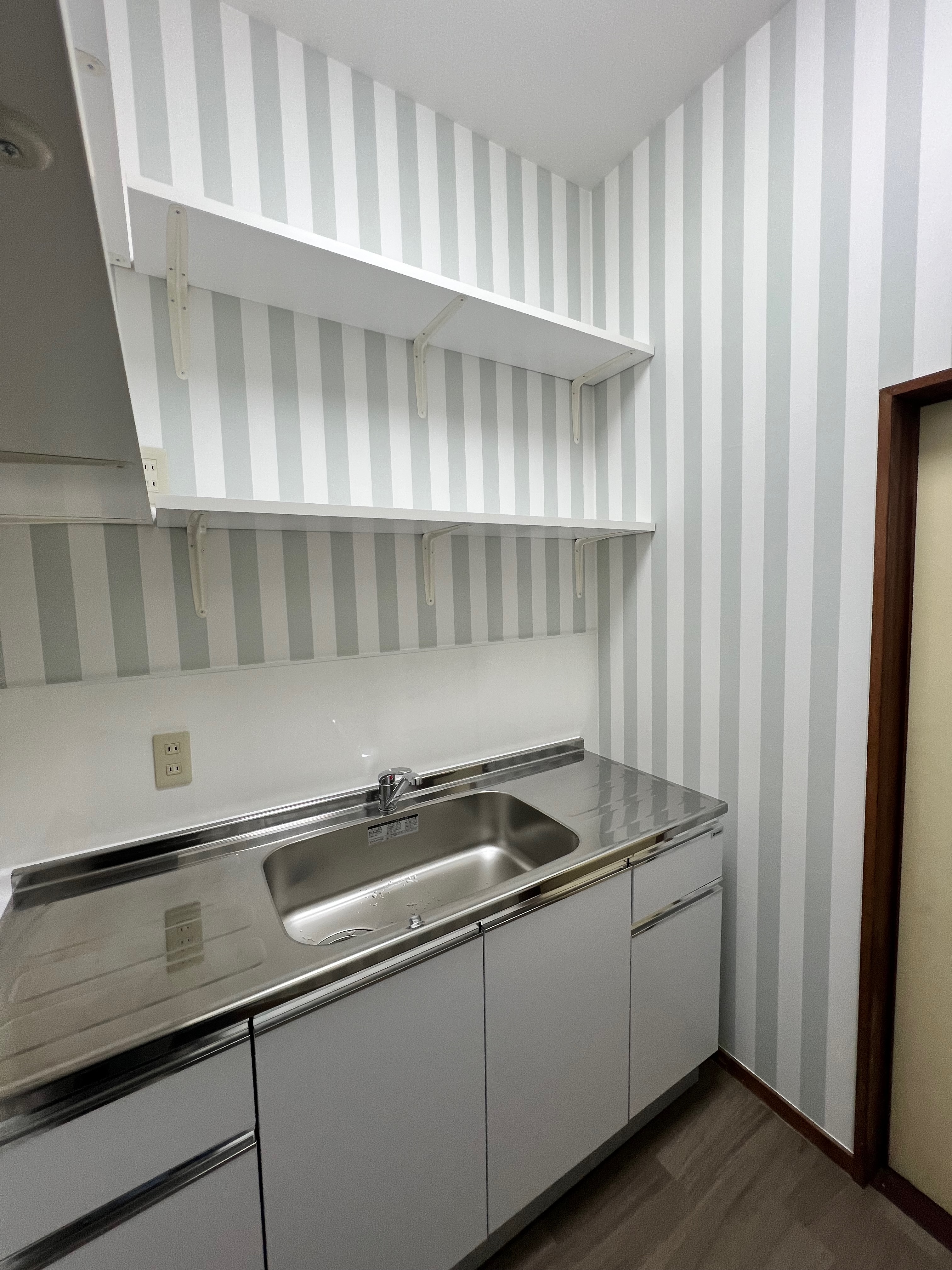 新築の頃から使われていた石の流し台から壁にキッチンパネルを貼りワンドのキッチンを設置しました。納戸としても使う予定なので以前の様な棚板を設置しました。天井・壁はクロスを貼って床は土足で使用出来るサンゲツのエスリュームを使用しました。