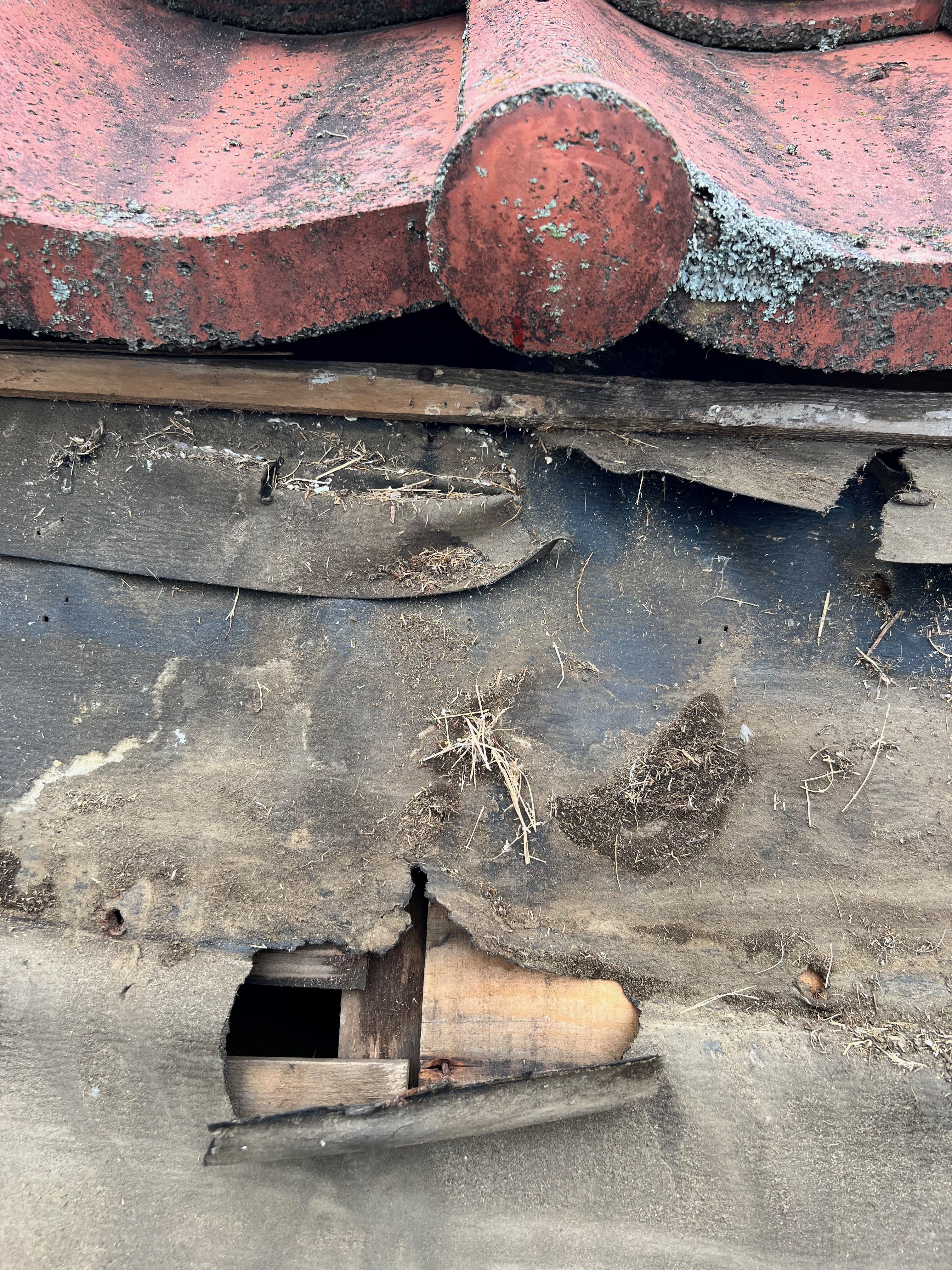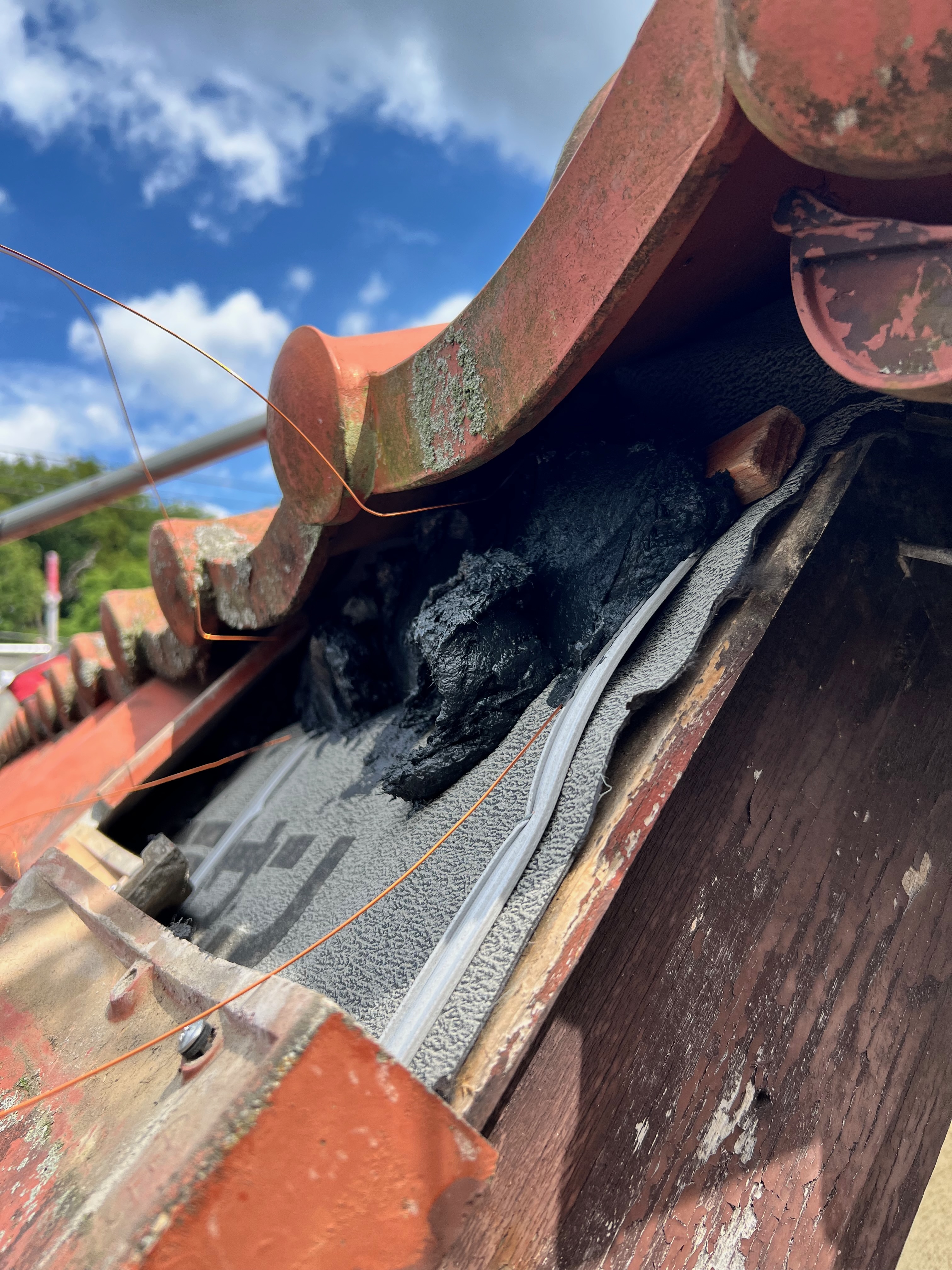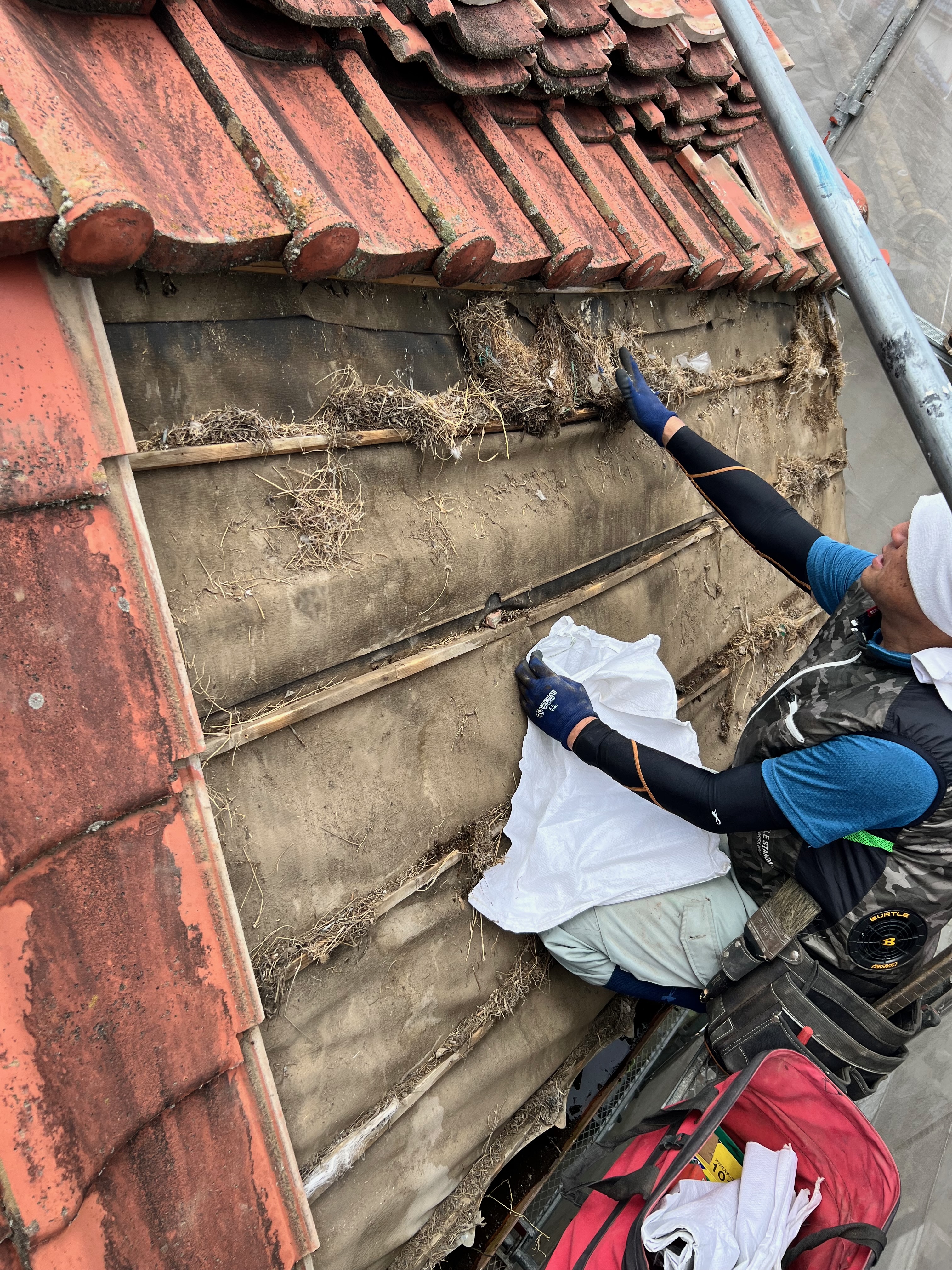 今後は鳥が入らない様にルーフィングを立ち上げて隙間は漆喰で埋めたのでこれで安心です。