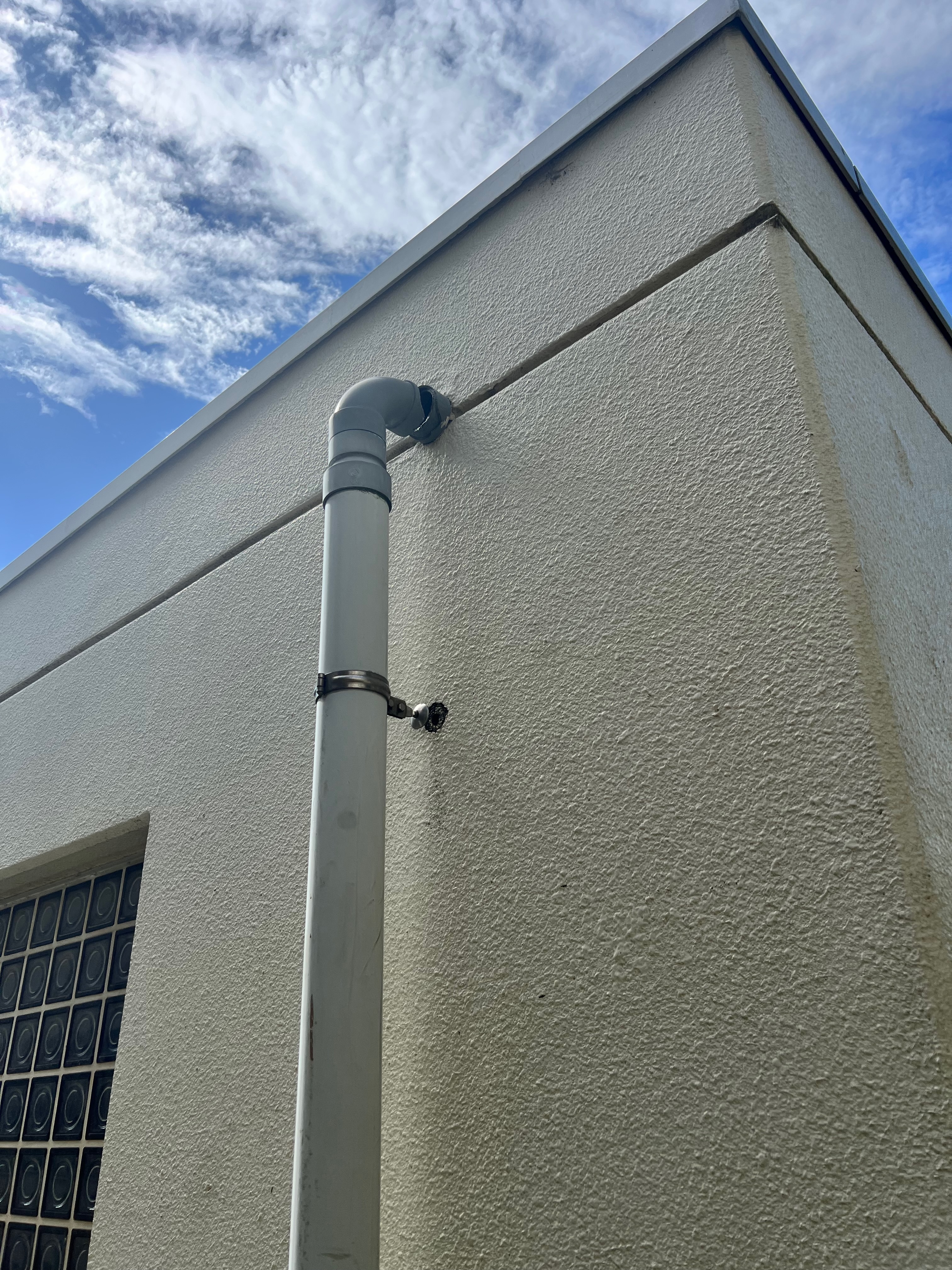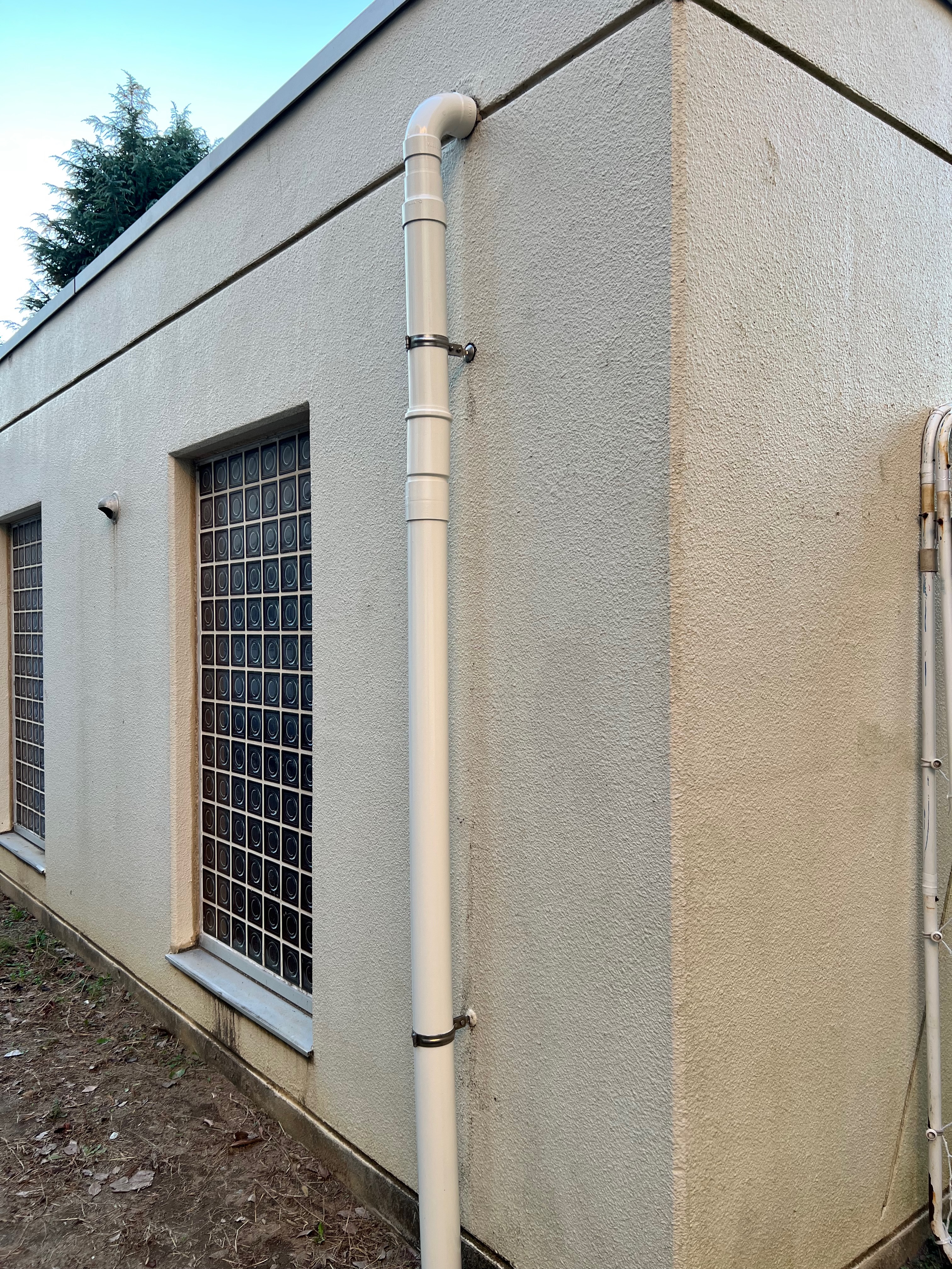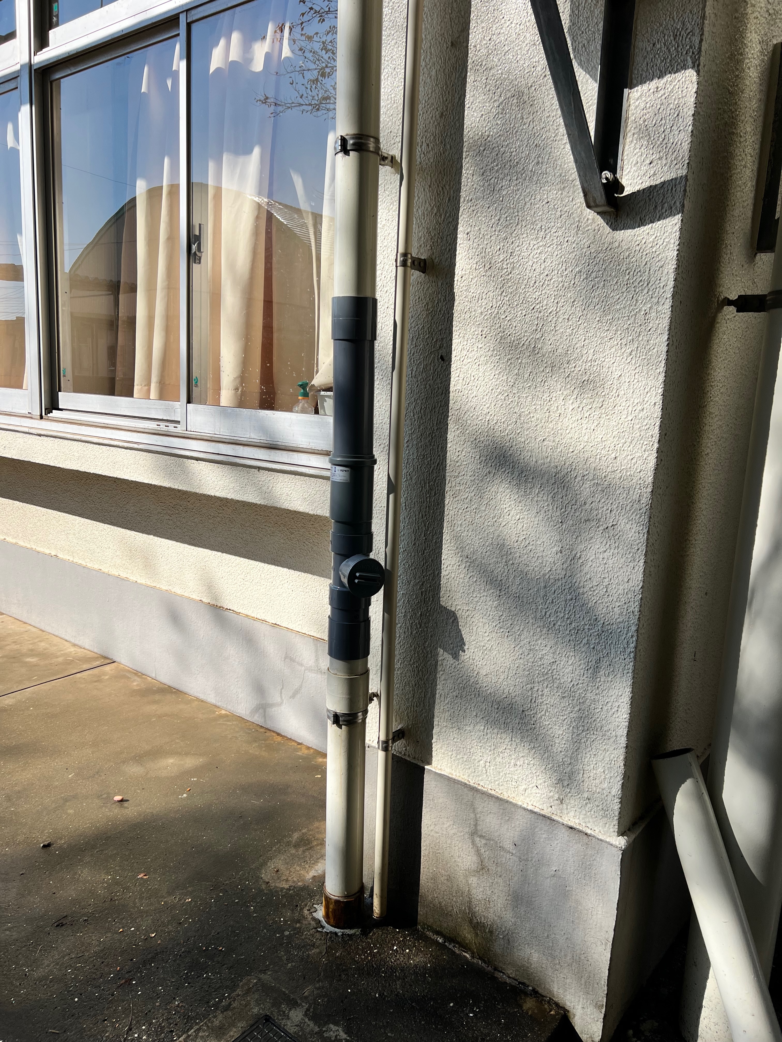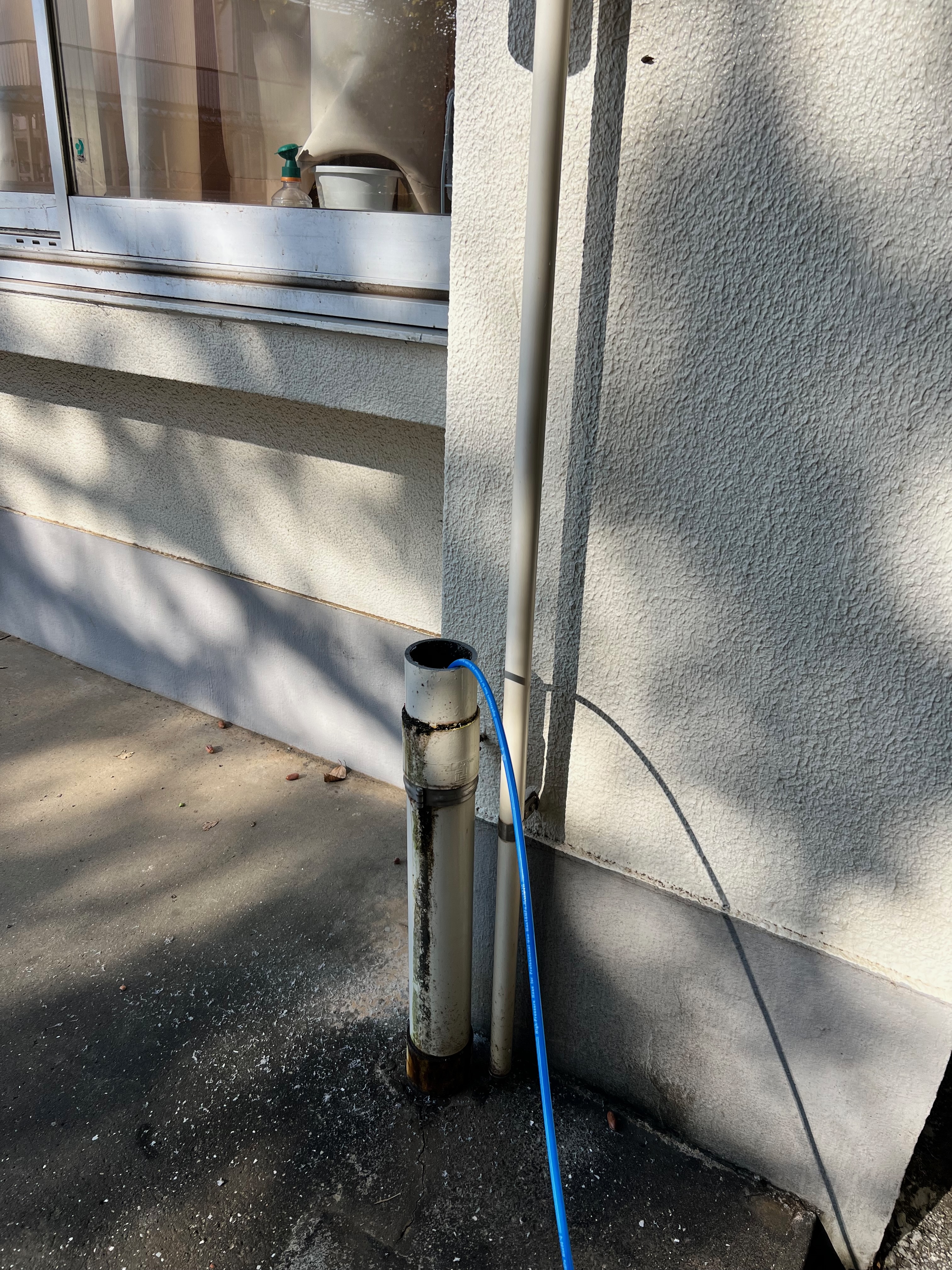 排水がつまっていたので竪樋を取って高圧洗浄機でパイプクリーニングしました。