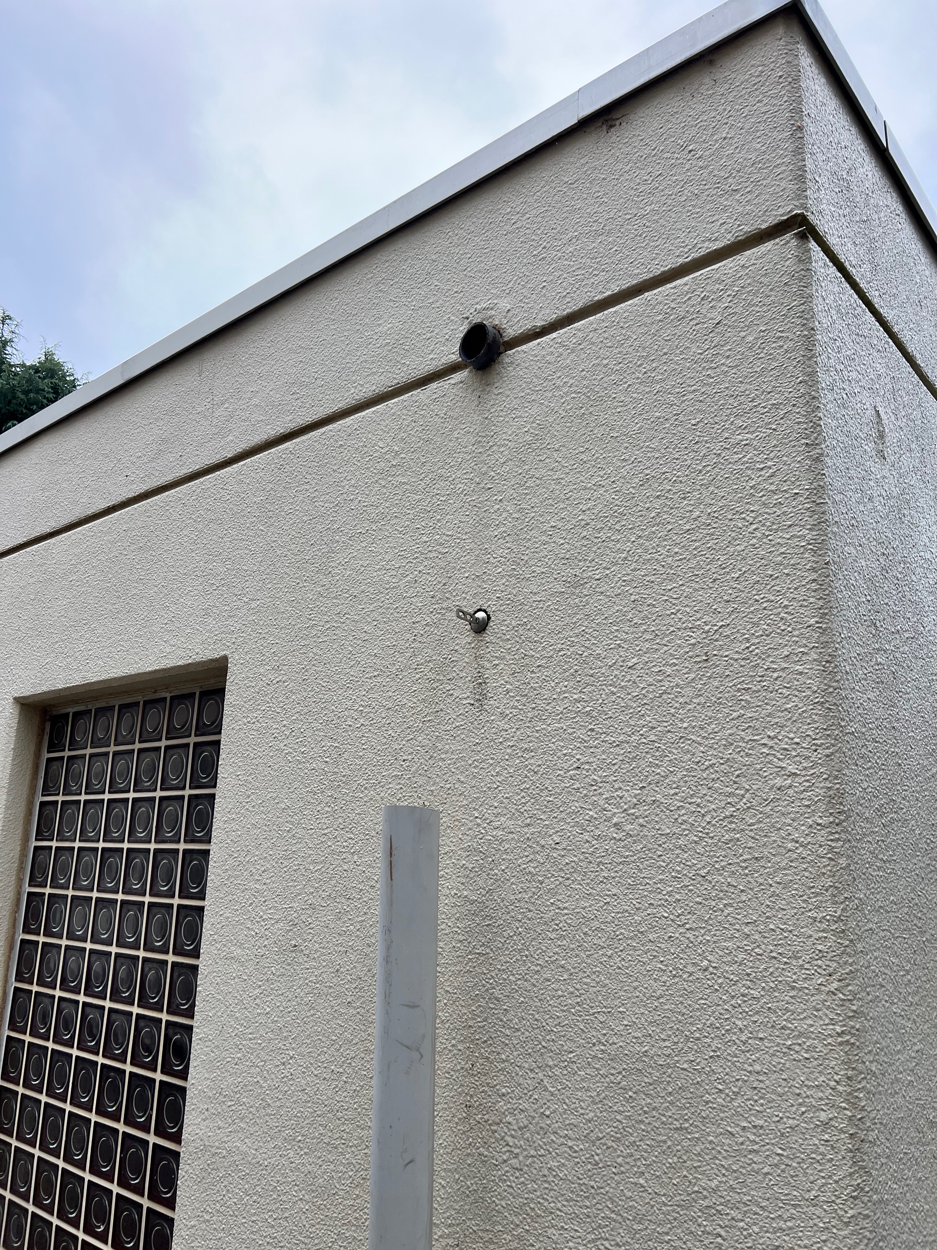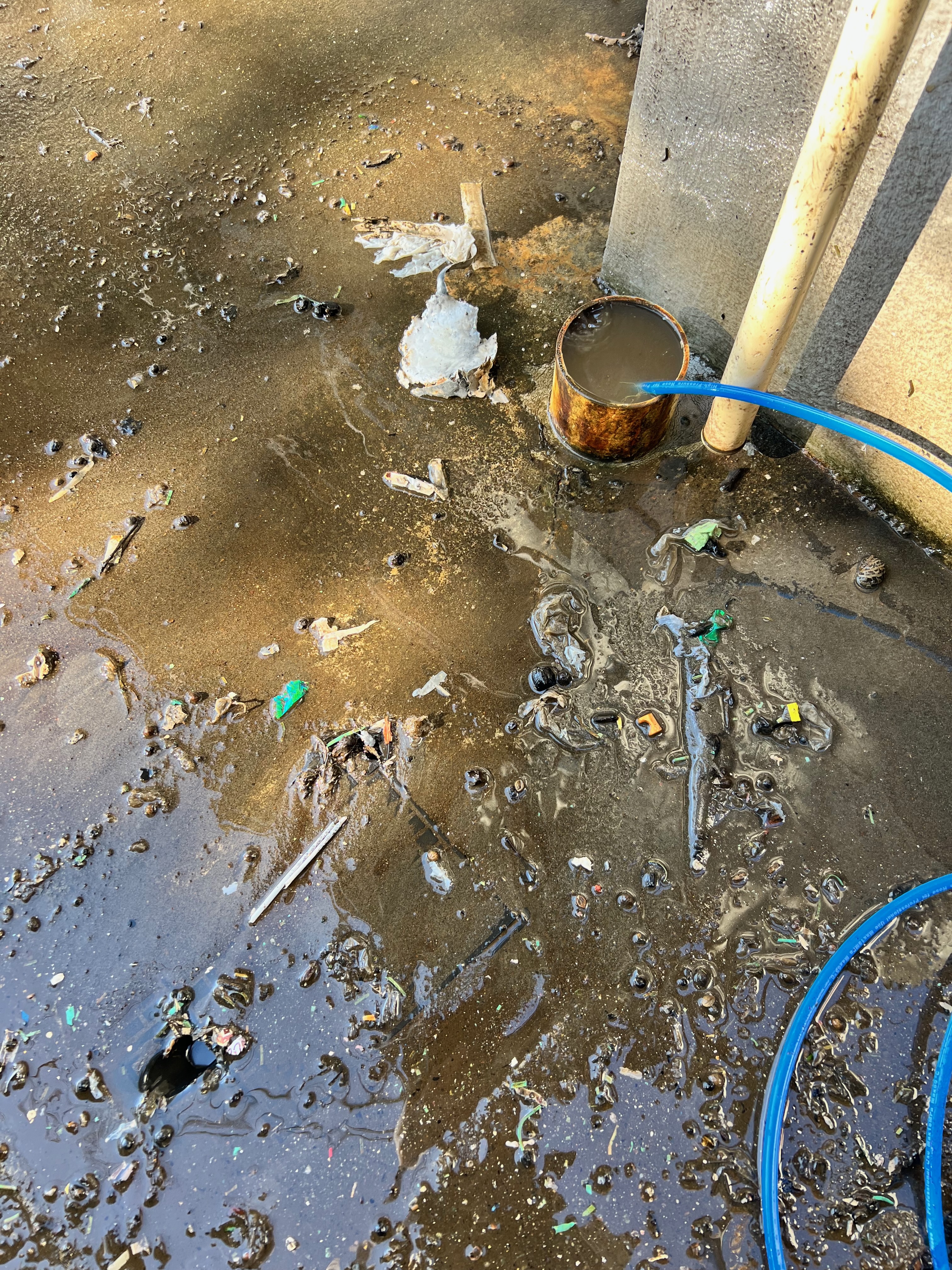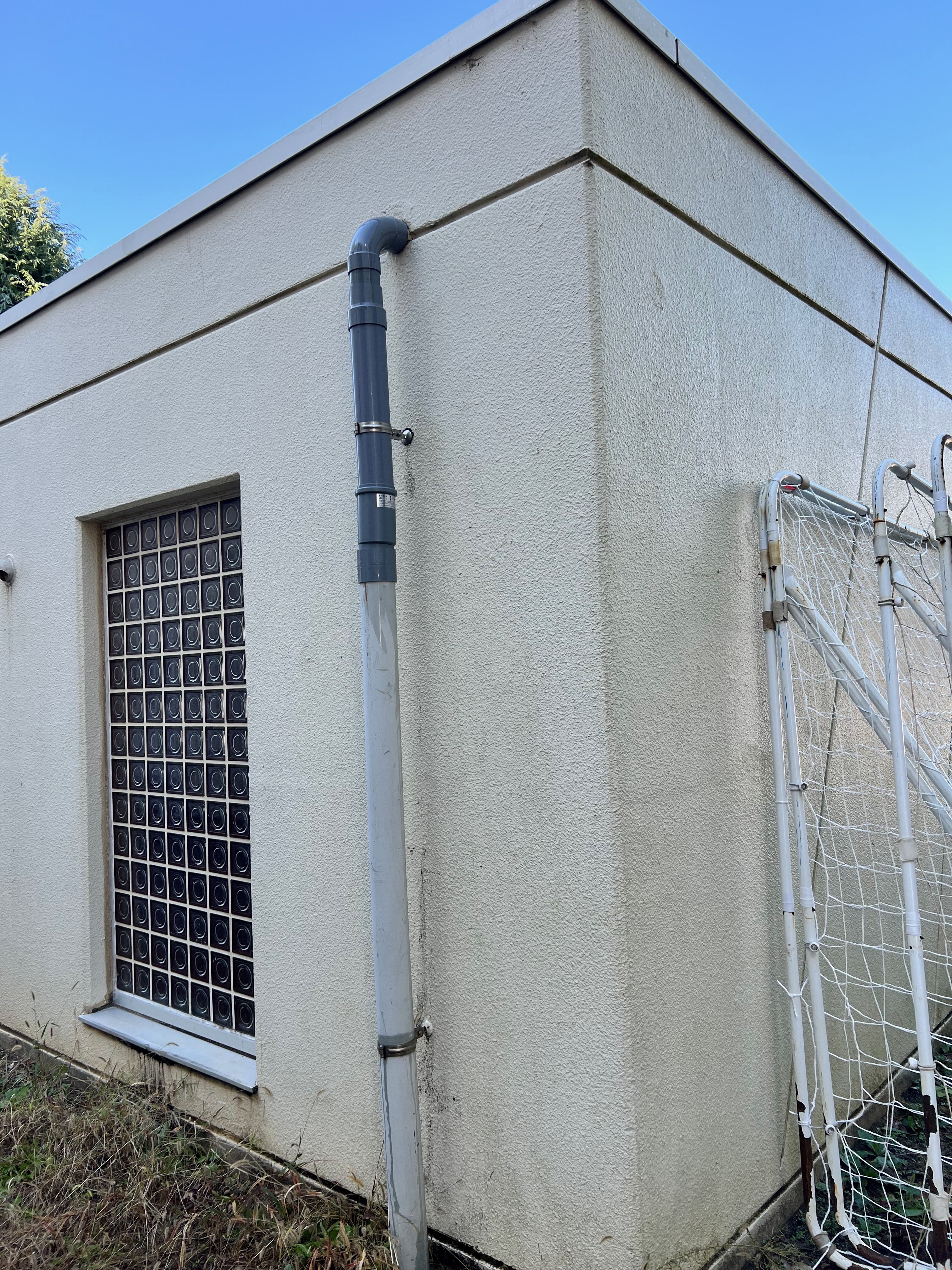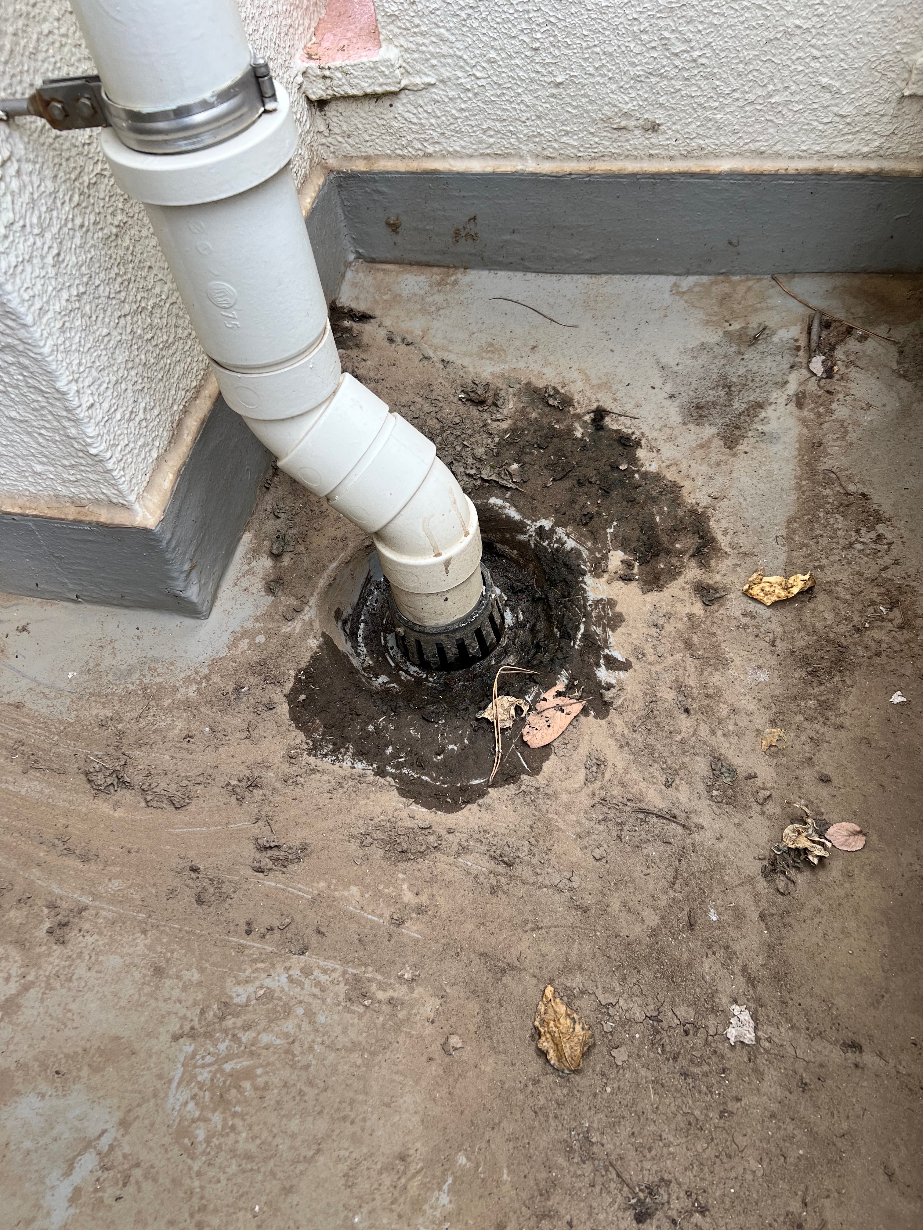 排水がつまっていたので竪樋を取って高圧洗浄機でパイプクリーニングしました。