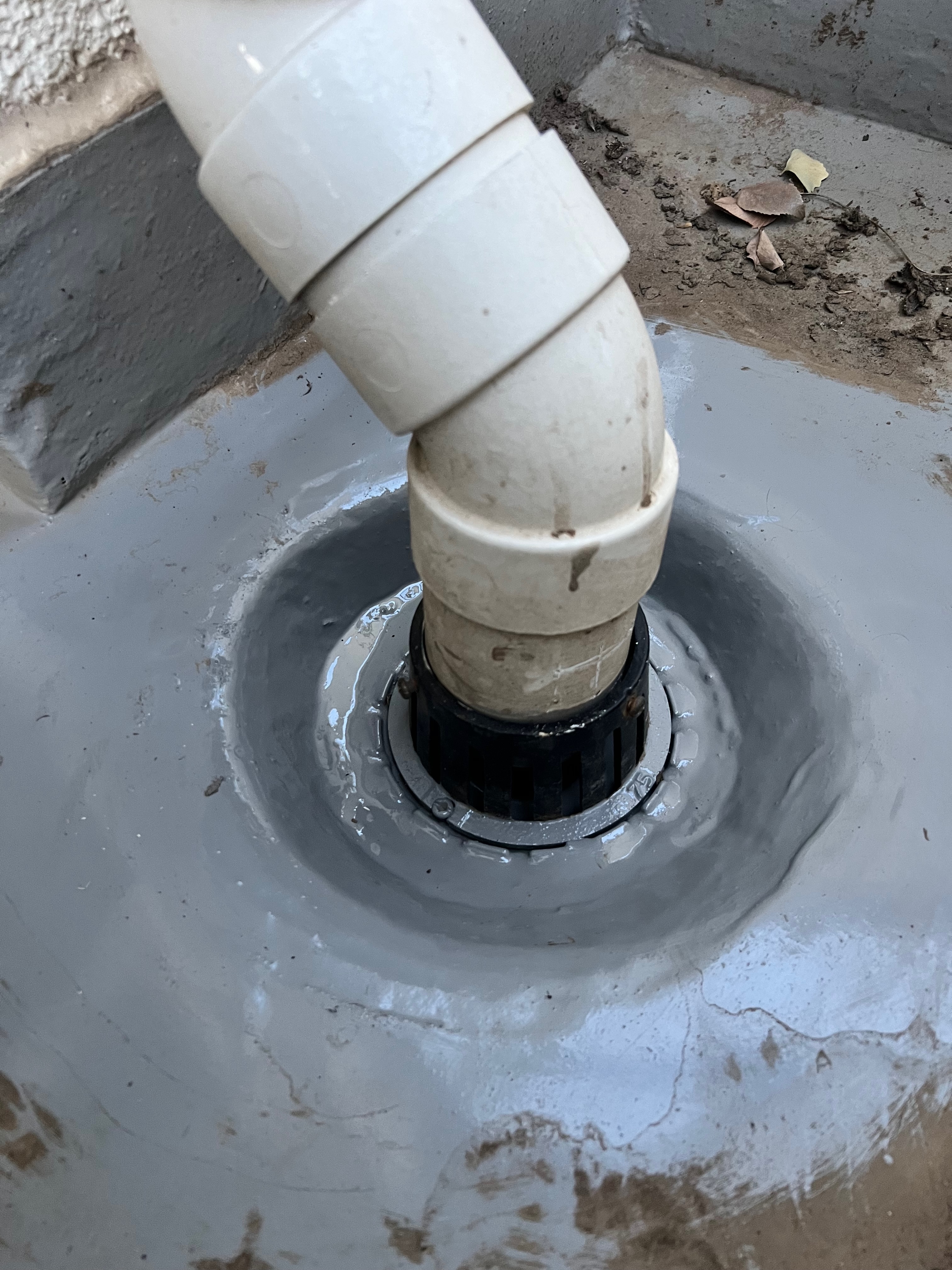 劣化により破損した外トイレの竪樋の補修とベランダドレン排水溝廻りの防水工事と